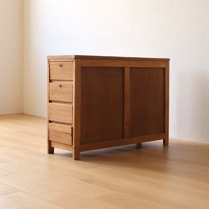 両面引き出しの脇机のご紹介です。届いてすぐにお使いできるように補修修復してあります。材質は本体はラワン材、その他、引き出し内側はベニヤです。食卓テーブルのサイドテーブル、壁面で使用してチェストの変わりにしてお気に入りのポスターなども貼ったり色々な使い方ができそうです。店舗什器としてもお使いいただけますね。あなたのライフスタイルにあった使い方でアンティークを是非楽しんでみてください。