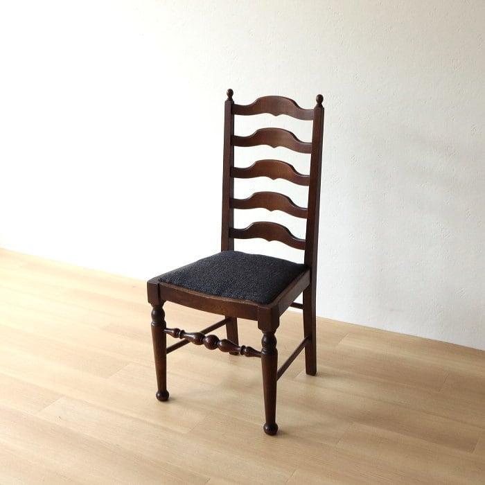 アンティークのハイバックダイニングチェアーです。可愛らしいろくろ脚タイプのイスです。材質はナラ無垢材です。あなたのライフスタイルに合わせて素敵にお使いください。