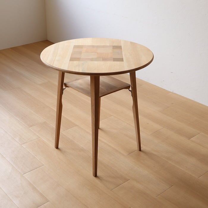 アンティークの寄木丸テーブルです。塗装は剥離してあります。天板の主材はタモ、脚はナラ、寄木部分は突板ではなく色々な無垢材です。ディティールが本当に美しい時代を感じさせるテーブルですね。メンテナンスしてあるのですぐに使用できます。店舗什器やオブジェなどにもいかがでしょうか。あなたのライフスタイルに合わせて素敵にお使いください。