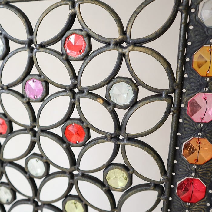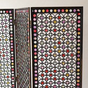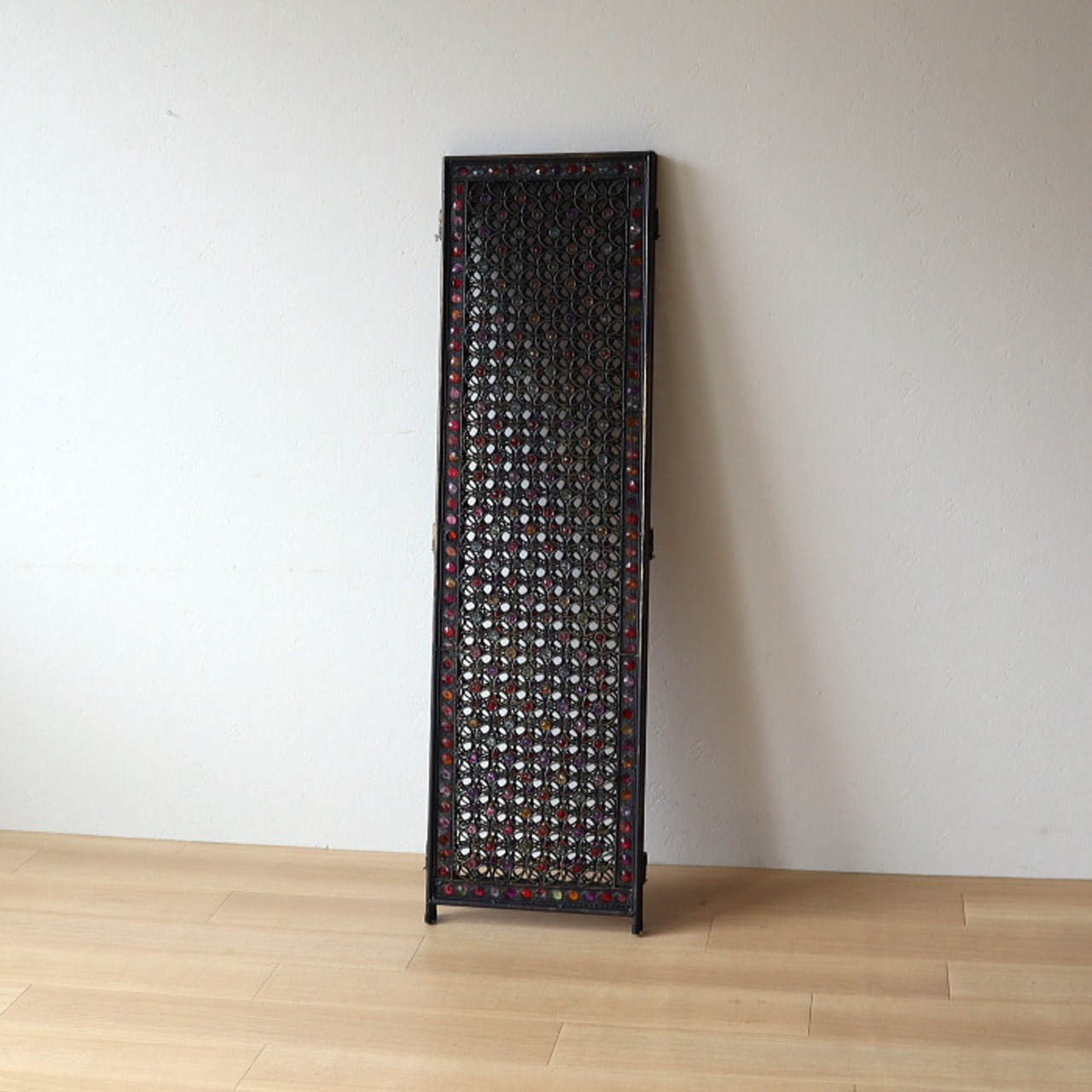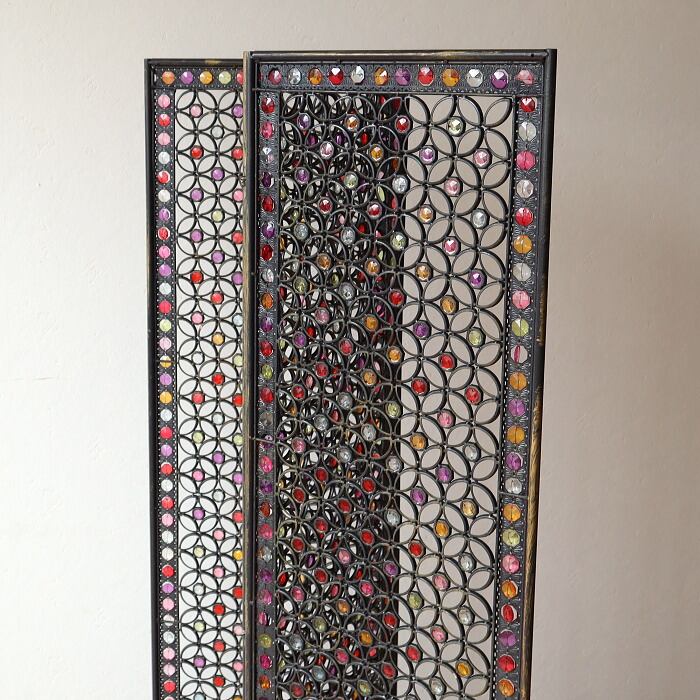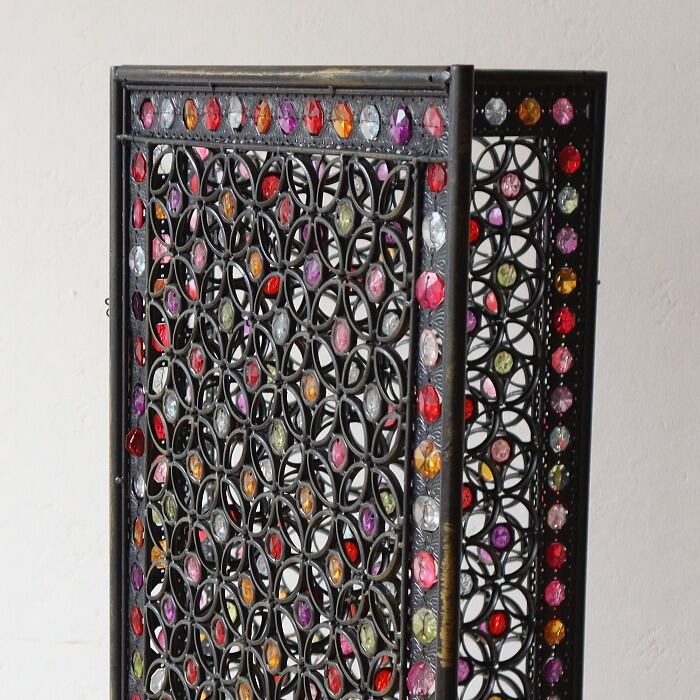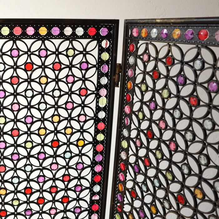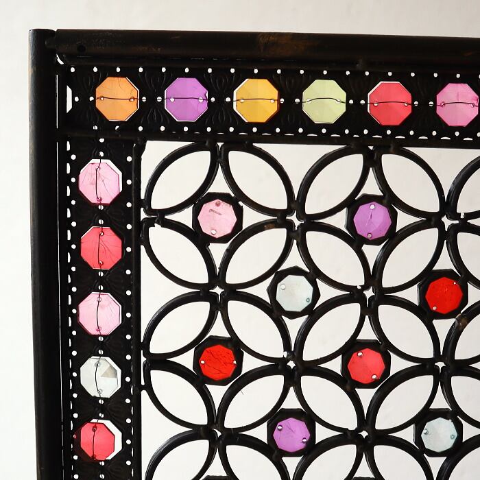 アイアンにアクリルビーズをワイヤーでひとつひとつ付けた万華鏡のような凝ったデザインのパーテーションです。デザインされた隙間から光と風が通る事で閉塞的にならず、開放感を残しつつ空間を仕切ることができます。