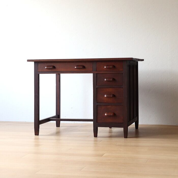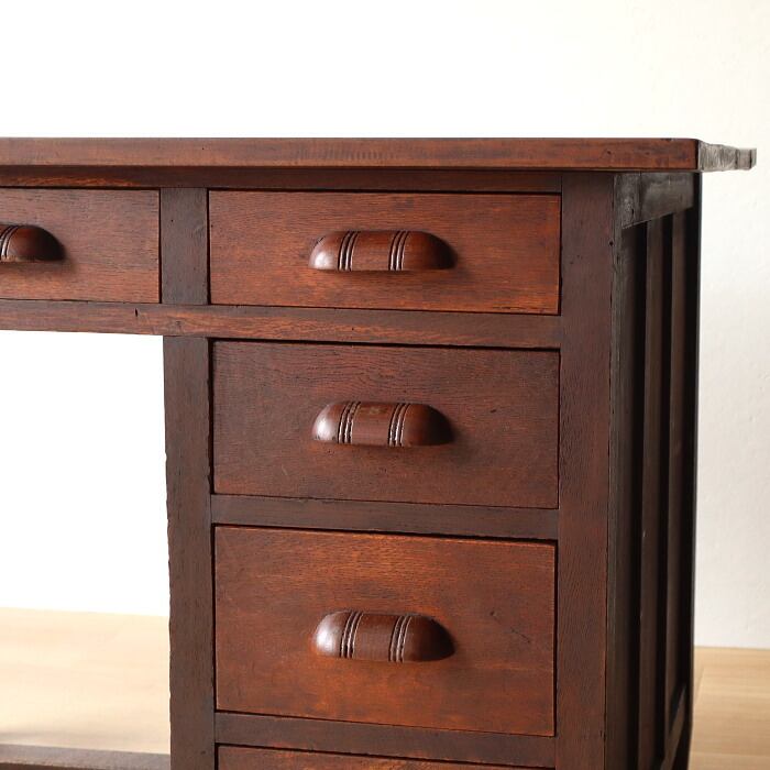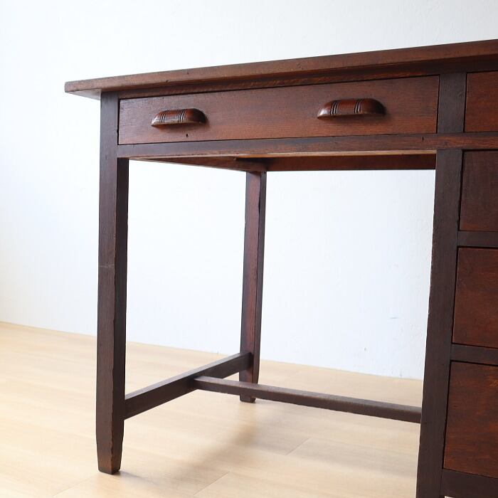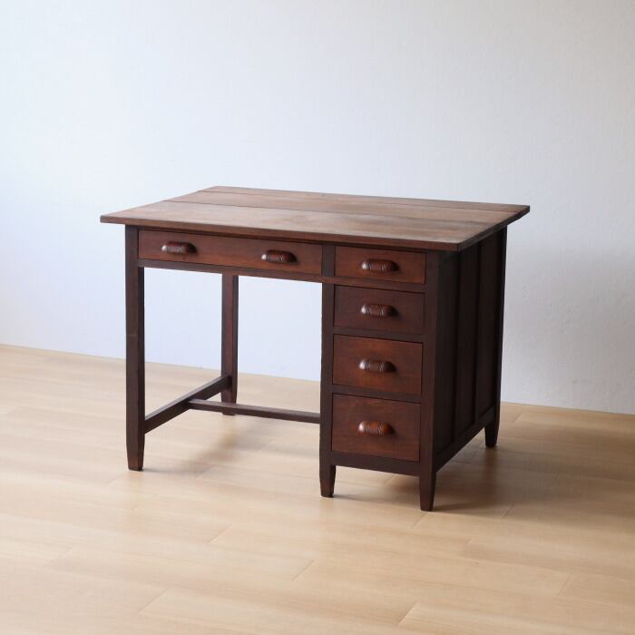 レトロな片袖机のご紹介です。天板はトチ、脚等はナラ材で木目が美しいデスクです引き出し5杯の机になります。補修、修復しており届いてすぐにお使いいただけます。店舗什器やオブジェなどにもいかがでしょうか。雰囲気のある机をあなたのライフスタイルに合わせて素敵にお使いください。