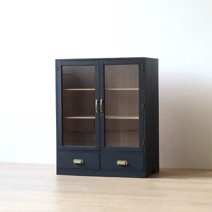 アンティーク 黒色 ガラス開き扉 収納棚 古家具 真鍮金具 木製