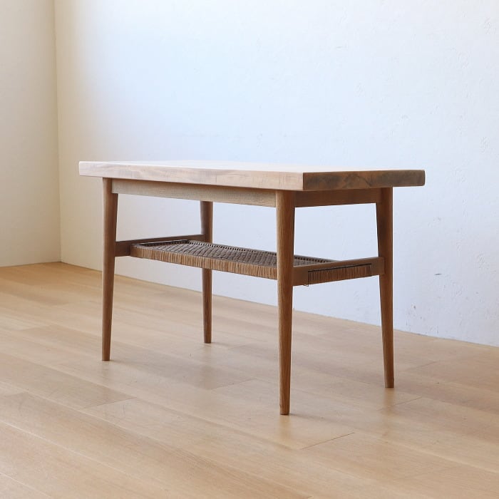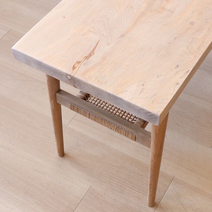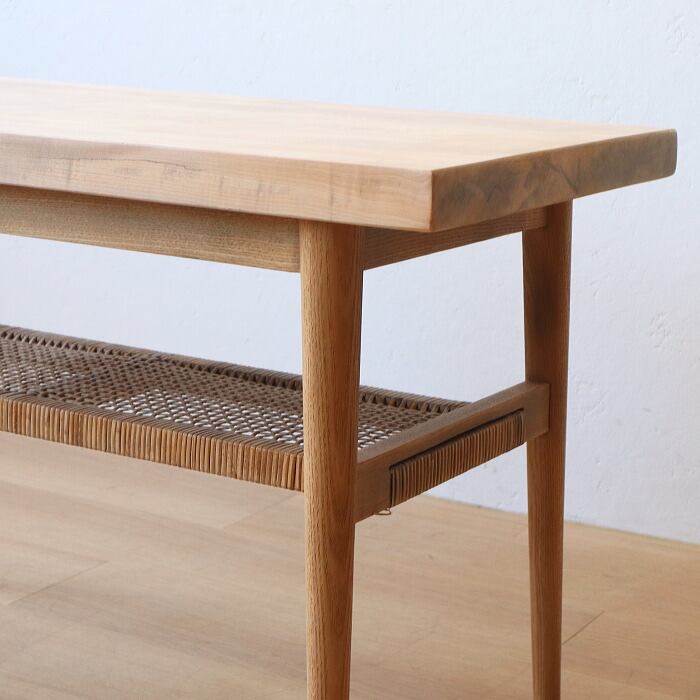 カエデ無垢材の天板を使用したサイドテーブルです。中間の棚板はラタンで巻いてありとてもお洒落なテーブルです。天板の厚みは36mmありトチの古材が映えます。補修、修復、メンテナスしてあるので届いてすぐに使用できます。ソファーテーブルはもちろんオブジェなどにも使えそうですね。あなたのライフスタイルに合わせて素敵にお使いください。