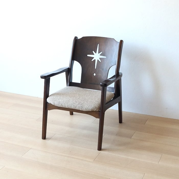 無垢材のアームチェアです。背のくり抜き加工が時代を感じさせますね。レトロモダンでとても良い感じのイスです。座面は張り替えてありコンディションは良好です。フレーム材質はブナ無垢材です。メンテナンスしてあるのですぐに使用できます。店舗什器やオブジェなどにもいかがでしょうか。あなたのライフスタイルに合わせて素敵にお使いください。